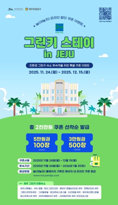 이와 관련, 제주관광공사 관계자는 “제주의 지속 가능한 여행 문화 확산을 위해 본 이벤트를 추진하고 있다”며 “이번 프로모션을 통해 관광객들이 친환경 숙소를 더 쉽게 이용하고, 책임 있는 여행을 실천하는 계기가 되길 기대한다”고 전했다.