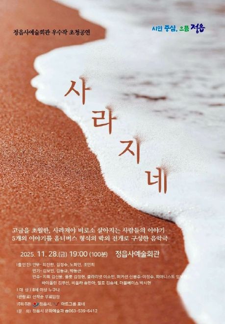 [비건뉴스=최지영 수습기자] 정읍시가 오는 28일 오후 7시 정읍사예술회관에서 음악과 연극, 무용을 결합한 창작 음악극 ‘사라지네’를 무대에 올린다.
