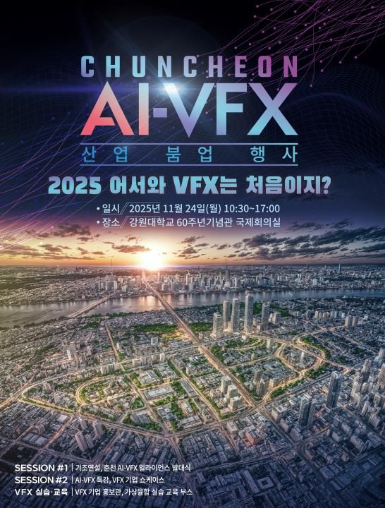 [비건뉴스=최지영 수습기자] 춘천시는 2025년 11월 24일 강원대학교 60주년 기념관 국제 회의실에서 ‘춘천 AI-VFX 산업붐업행사 – 2025 어서와! VFX는 처음이지?’를 개최한다고 밝혔다.