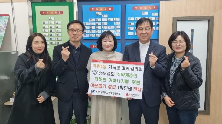 같은 날 옥련1동 지역사회보장협의체는 송도감리교회로부터 이웃돕기 성금 100만 원을 전달받았다.