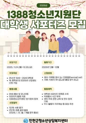 [비건뉴스=최지영 수습기자] 충북 진천군청소년상담복지센터는 이달 24일부터 대학생 대상 서포터즈 프로그램 ‘2026년 1388청소년지원단 대학생 서포터즈’ 참가자를 모집한다고 밝혔다.