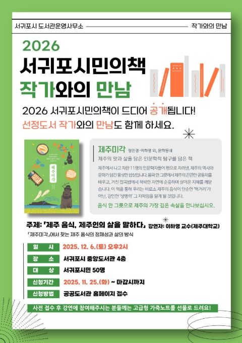 [비건뉴스=최지영 수습기자] 서귀포시는 12월 6일 오후 2시, 서귀포시 중앙도서관에서 2026년 서귀포시민의 책으로 선정된 '제주미각'의 저자 이하영 교수를 초청해 작가와의 만남을 운영한다.