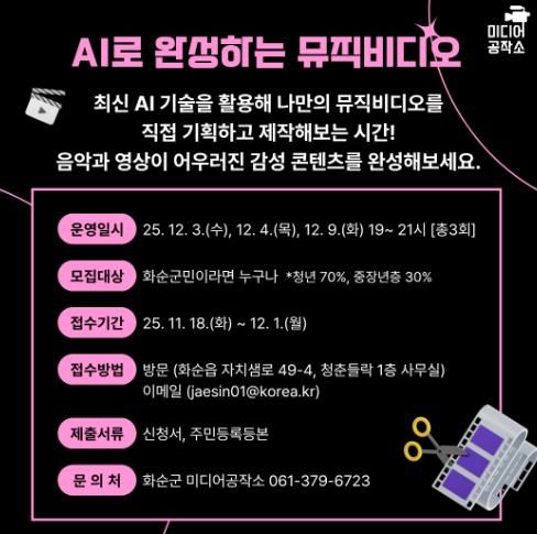 [비건뉴스=최지영 수습기자] 화순군은 오는 12월 3일부터 화순군민을 대상으로 화순군 청년센터(청춘들락) 미디어공작소에서 ‘AI로 완성하는 뮤직비디오 영상 제작하기’ 교육을 진행한다고 밝혔다.