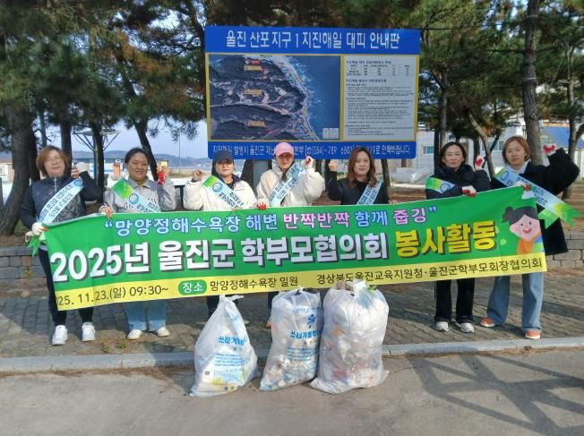 [비건뉴스=최지영 수습기자] 울진교육지원청은 11월 23일 09시 30분 “먕양해수욕장 해변 반짝반짝 함께 줍깅”이란 슬로건 아래 '2025년 울진군 학부모장협의회 봉사활동'을 실시했다.