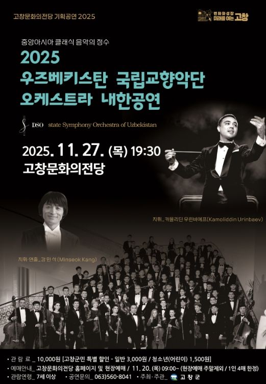 [비건뉴스=최지영 수습기자] 오는 27일 저녁 7시30분 고창문화의전당에서 ‘우즈베키스탄 국립교향악단 오케스트라 내한공연’이 진행된다.