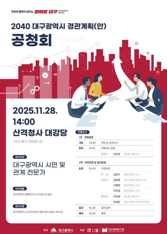 특히 이번 공청회는 법적 절차를 넘어, 시민들과 함께 대구의 미래 도시경관 방향을 논의하는 공론의 장으로 마련할 예정이다.