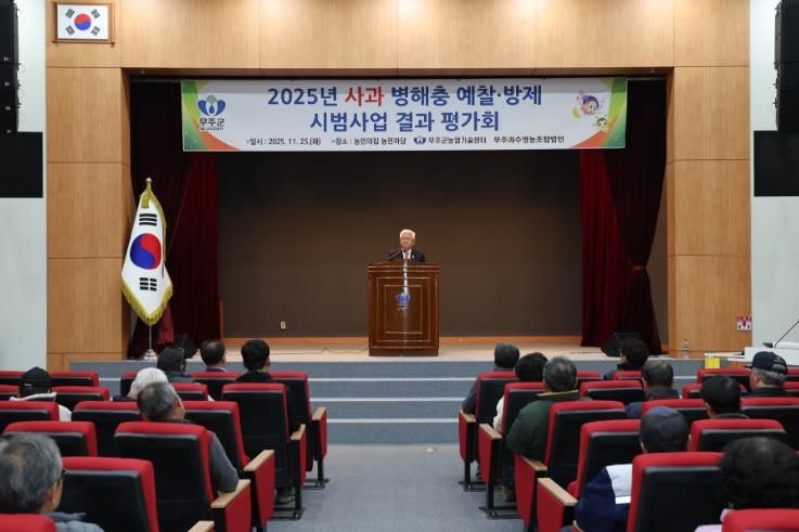 [비건뉴스=최지영 수습기자] 무주군은 지난 25일 농민의 집 농민마당에서 ‘2025 사과 병해충 예찰 방제 시범사업’ 평가회를 개최했다고 밝혔다.