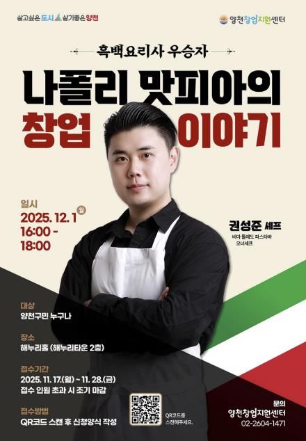 이기재 양천구청장은 “불안정한 청년기와 창업 실패를 거쳐 성장한 권성준 셰프의 생생한 경험이 요식업 창업을 준비하는 구민에게 큰 용기와 실질적 도움이 되길 바란다”며 “앞으로도 지역 내 지속 가능한 창업 생태계 구축을 위해 다양한 지원 정책을 강화해 나가겠다”고 말했다.
