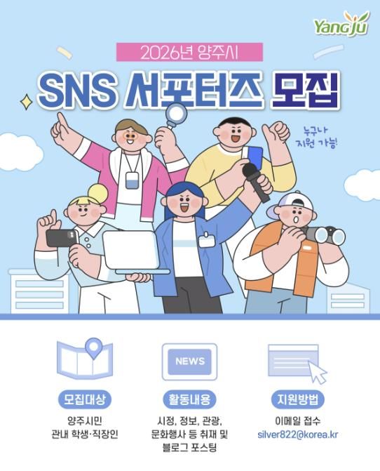 [비건뉴스=최지영 수습기자] 양주시가 시민과 소통하며 시정 소식과 지역의 숨은 매력을 널리 알릴 '2026년 양주시 SNS 서포터즈'를 오는 12월 1일부터 10일까지 10일간 모집한다.