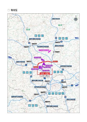 구미~군위 고속도로는 구미에서 군위군 효령면(중앙고속도로)까지 총 21.2km 구간을 4차로로 신설하는 사업으로, 사업비는 약 1조 5,627억 원 규모다. 이는 1970년 경부고속도로 이후 55년 만에 구미를 통과하여 동서를 잇는 첫 고속도로라는 점에서 의미가 크다.