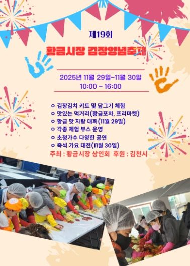 [비건뉴스=최지영 수습기자] 김천시에서는 오는 29일~30일 황금동 한신로 일원에서 ‘제19회 황금시장 김장양념축제’를 개최한다고 밝혔다.