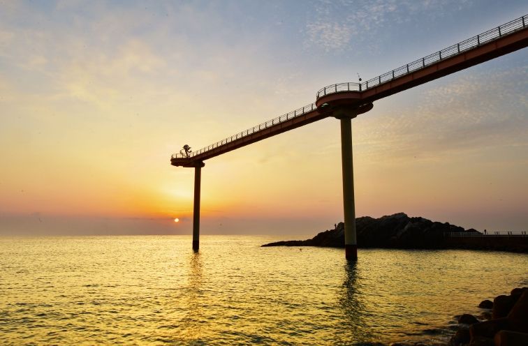 비단결 후포 바다를 가르며 존재감을 뿜어내는 후포 등기산 스카이 워크.그리고 비단결 후포 바다 위에 내린 새벽 첫 빛이 장관을 연출한다.