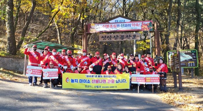 [비건뉴스=최지영 수습기자] 경산시는 가을철 건조한 날씨로 산불 위험이 높아지는 가운데 성암산 입구에서 가을철 산불에 대비하여 산불 예방 캠페인을 실시한다고 밝혔다.