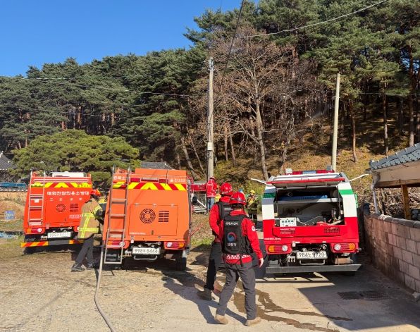[비건뉴스=최지영 수습기자] 울진소방서는 28일 울진군 기성면 소재 울진 평해황씨 해월종택에서 중요 목조문화재 및 산불진화 유관기관 합동소방훈련을 실시했다.