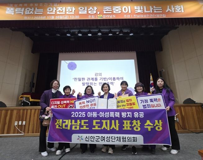 [비건뉴스=최지영 수습기자] 신안군여성단체협의회(회장 안미영)가 11월 28일 전남여성가족재단에서 개최된 ‘2025년 여성폭력추방주간 기념행사’에서 여성폭력 방지 유공을 인정받아 전남도지사 표창을 수상하는 영예를 안았다.