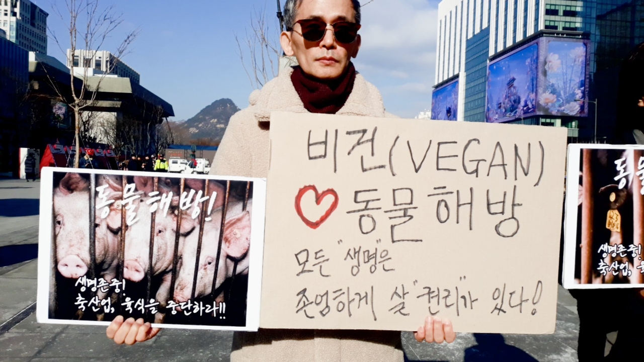 [비건뉴스=최유리 기자] 국제 동물권리의 날을 맞아 한국동물보호연합, 한국비건채식협회, 기후위기비건연대, 한국비건연대, 비건세상을위한시민모임이 12월 9일 서울 광화문 이순신 동상 앞에서 공동 기자회견을 열고 동물권 보장과 비건 실천을 촉구했다.