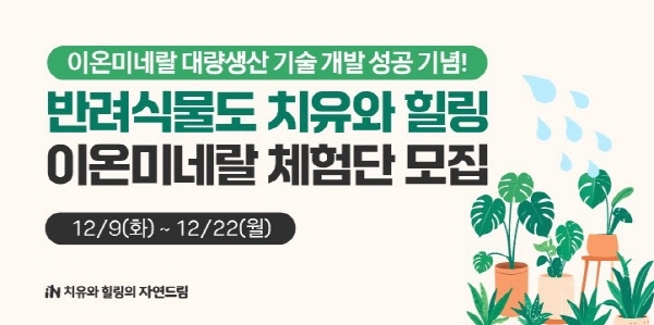 체험단 모집은 그동안 생산 농가에서만 활용되던 이온미네랄을 가정과 사무실에서도 사용해 볼 수 있도록 마련된 프로그램으로, 12월 9일부터 반려식물용 이온미네랄 체험단 1000명을 대상으로 진행된다. 참여는 자연드림 홈페이지 회원 가입 후 가능하다.