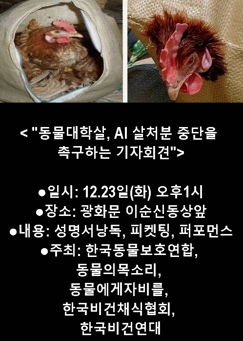 한국동물보호연합과 동물의목소리, 동물에게자비를, 한국비건채식협회, 한국비건연대는 12월 23일 오후 1시 서울 종로구 광화문 이순신동상 앞에서 ‘동물대학살, AI 살처분 중단을 촉구하는 기자회견’을 개최할 예정이다.