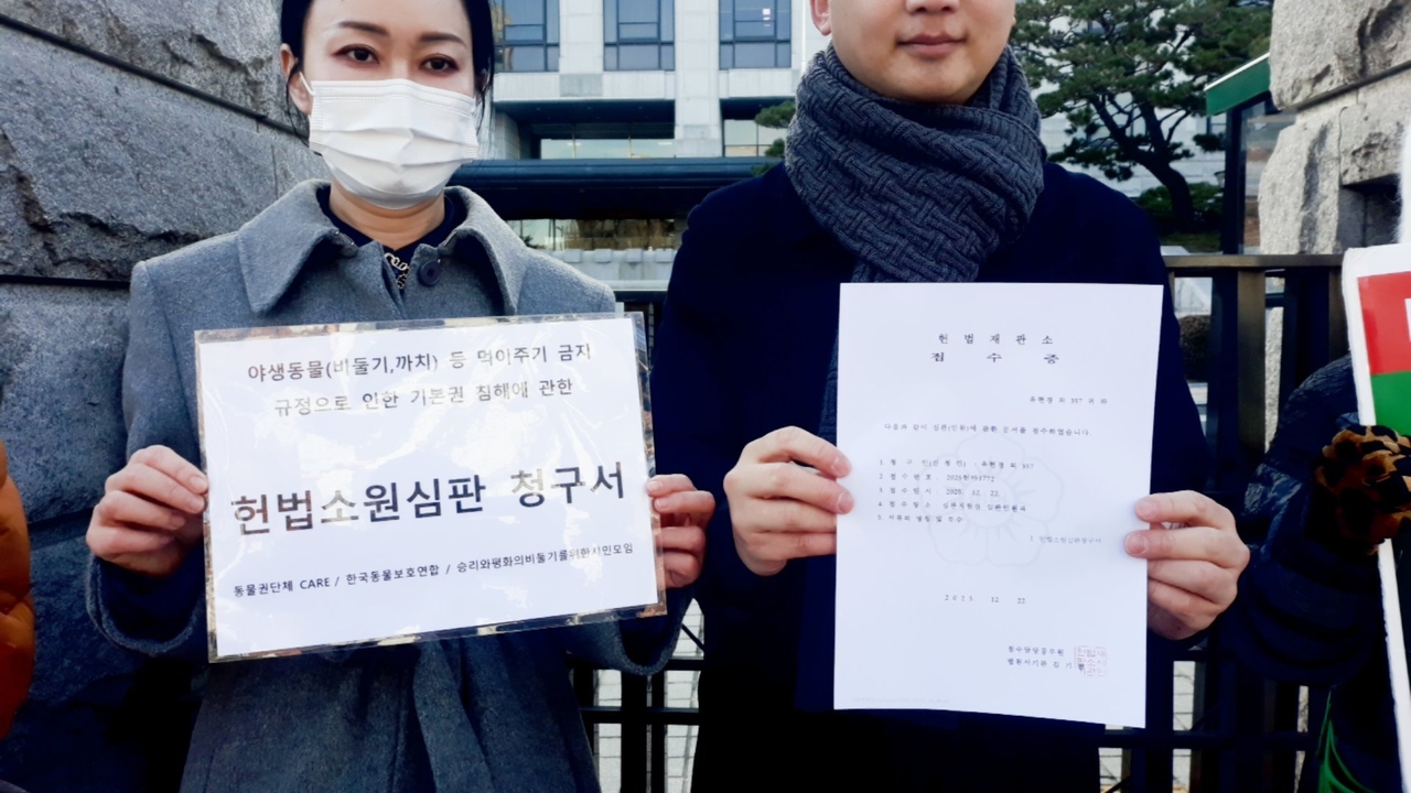 [비건뉴스=최유리 기자] 동물권단체 케어와 한국동물보호연합, 승리와평화의비둘기를위한시민모임은 22일 오후 서울 종로구 헌법재판소 정문 앞에서 기자회견을 열고, 비둘기 먹이주기 금지를 규정한 법과 조례에 대해 헌법소원을 제출했다.
