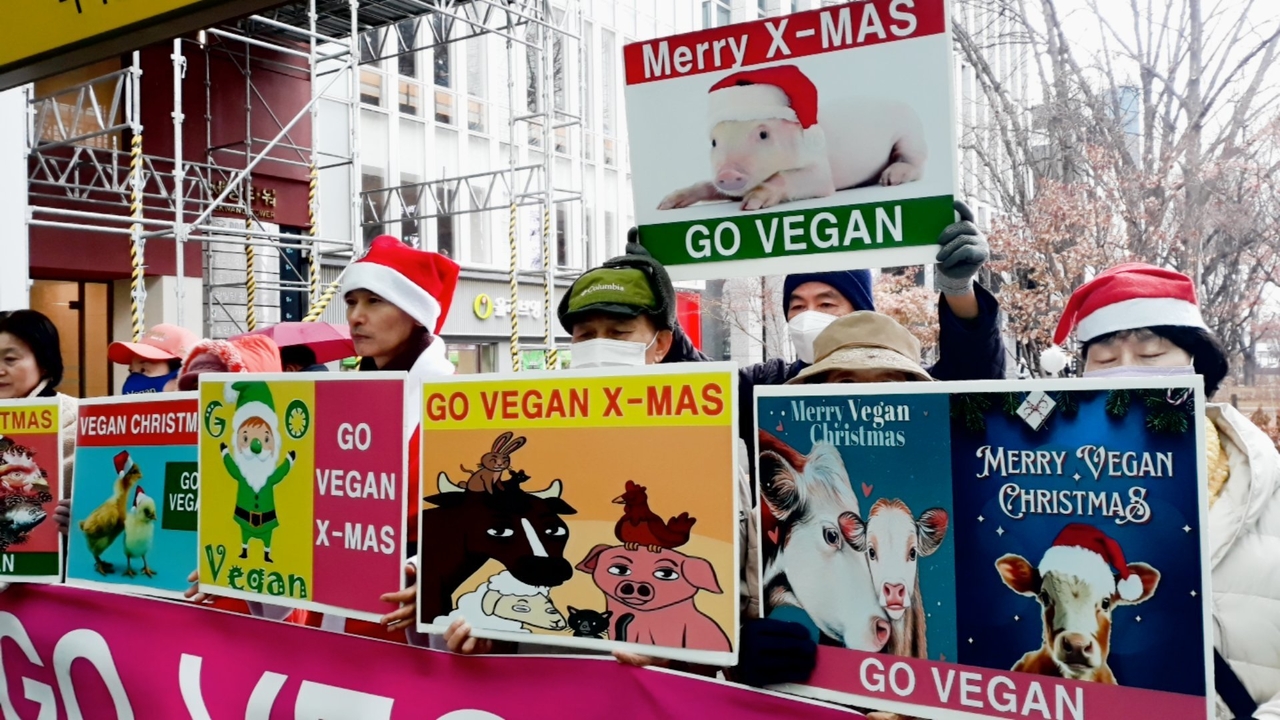 [비건뉴스=최유리 기자] 한국비건채식협회와 기후위기비건행동, 한국비건연대, 비건세상을위한시민모임, 한국채식연합은 23일 오후 서울 광화문 이순신동상 앞에서 기자회견을 열고 크리스마스를 맞아 인간과 동물, 지구가 함께 행복해지는 비건(Vegan) 크리스마스 실천을 촉구했다. 이들 단체는 성명서 낭독과 피켓팅, 퍼포먼스를 통해 건강·동물·환경을 살리는 비건 채식의 의미를 알리고, 동물의 희생이 없는 평화로운 성탄절이 돼야 한다는 메시지를 시민들에게 전했다.