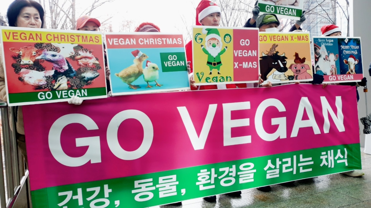 [비건뉴스=최유리 기자] 한국비건채식협회와 기후위기비건행동, 한국비건연대, 비건세상을위한시민모임, 한국채식연합은 23일 오후 서울 광화문 이순신동상 앞에서 기자회견을 열고 크리스마스를 맞아 인간과 동물, 지구가 함께 행복해지는 비건(Vegan) 크리스마스 실천을 촉구했다. 이들 단체는 성명서 낭독과 피켓팅, 퍼포먼스를 통해 건강·동물·환경을 살리는 비건 채식의 의미를 알리고, 동물의 희생이 없는 평화로운 성탄절이 돼야 한다는 메시지를 시민들에게 전했다.