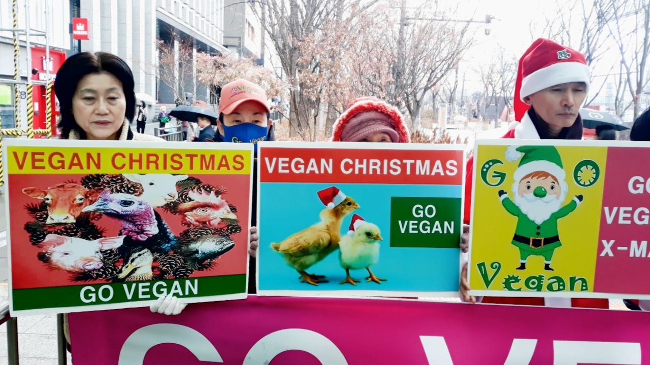 [비건뉴스=최유리 기자] 한국비건채식협회와 기후위기비건행동, 한국비건연대, 비건세상을위한시민모임, 한국채식연합은 23일 오후 서울 광화문 이순신동상 앞에서 기자회견을 열고 크리스마스를 맞아 인간과 동물, 지구가 함께 행복해지는 비건(Vegan) 크리스마스 실천을 촉구했다. 이들 단체는 성명서 낭독과 피켓팅, 퍼포먼스를 통해 건강·동물·환경을 살리는 비건 채식의 의미를 알리고, 동물의 희생이 없는 평화로운 성탄절이 돼야 한다는 메시지를 시민들에게 전했다.