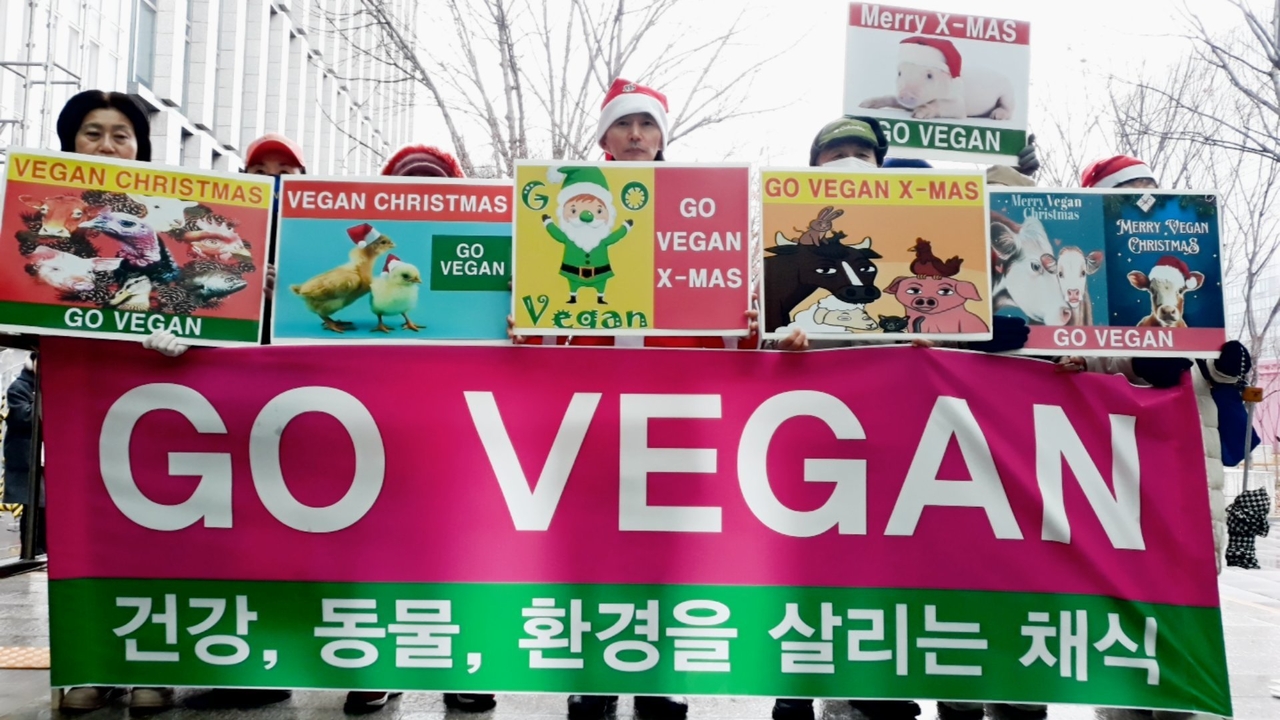 [비건뉴스=최유리 기자] 한국비건채식협회와 기후위기비건행동, 한국비건연대, 비건세상을위한시민모임, 한국채식연합은 23일 오후 서울 광화문 이순신동상 앞에서 기자회견을 열고 크리스마스를 맞아 인간과 동물, 지구가 함께 행복해지는 비건(Vegan) 크리스마스 실천을 촉구했다. 이들 단체는 성명서 낭독과 피켓팅, 퍼포먼스를 통해 건강·동물·환경을 살리는 비건 채식의 의미를 알리고, 동물의 희생이 없는 평화로운 성탄절이 돼야 한다는 메시지를 시민들에게 전했다.