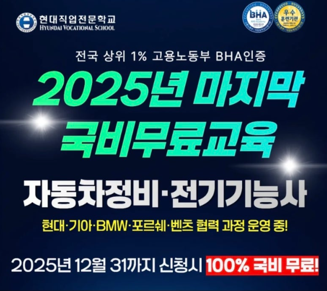[비건뉴스=박민수 기자] 대전 국비자동차정비학원인 현대직업전문학교는 친환경 전기(전기내선공사) 관리자 양성과정과 자동차정비산업기사 자격취득 과정에 대한 국비지원 무료교육 훈련생을 모집한다고 26일 밝혔다.