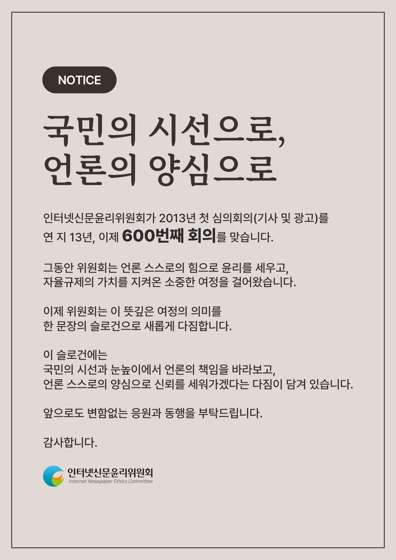 또한 2012년 출범 이후 기사 및 광고 심의분과회의 누적 개최 횟수가 600회를 돌파했다. 위원회는 이를 계기로 “국민의 시선으로, 언론의 양심으로”라는 슬로건을 발표하고, 국민 눈높이에서 언론의 공적 책임을 되짚으며 언론 스스로의 윤리의식과 자정 노력을 통해 신뢰를 쌓아가겠다는 방향을 제시했다.