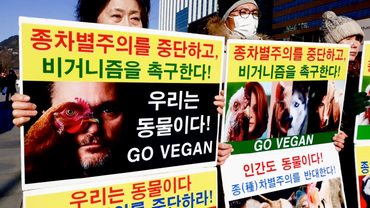 [비건뉴스=최유리 기자] 채식 시민단체들이 지난 30일 오후 1시 서울 광화문 이순신동상 앞에서 ‘종차별주의’를 중단하고 ‘비거니즘’ 실천을 촉구하는 기자회견을 열었다. 참가자들은 성명서 낭독과 피켓팅, 퍼포먼스를 통해 인간 중심적 사고가 동물 억압과 착취로 이어지고 있다며 사회 전반의 인식 전환을 요구했다. 이날 기자회견은 한국비건채식협회, 기후위기비건행동, 한국비건연대, 비건세상을위한시민모임, 한국채식연합이 공동으로 참여했다.