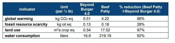 이 같은 수치를 미국 기준 80/20 비율의 4분의 1파운드 쇠고기 패티와 비교하면, 비욘드 버거 4.0은 온실가스를 88% 적게 배출하고, 비재생에너지 사용은 28%, 물 소비는 92%, 토지 이용은 97% 적은 것으로 나타났다. 공급망에서 발생하는 토지 이용 변화 배출을 포함해도 온실가스 배출은 쇠고기 대비 86% 낮았다.