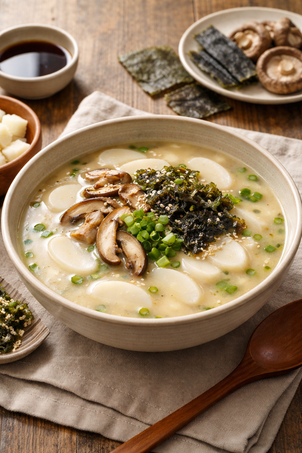 여기에 떡국용 가래떡을 넣고 떡이 말랑해질 때까지 끓인다. 간은 간장이나 된장으로 맞추되 소량씩 조절하는 것이 좋다. 마지막으로 대파를 넣고 불을 끈 뒤 참기름을 한두 방울 떨어뜨리면 고소한 향이 살아난다. 고명으로는 구운 김이나 볶은 표고버섯 채를 올려 식감과 영양을 더할 수 있다.