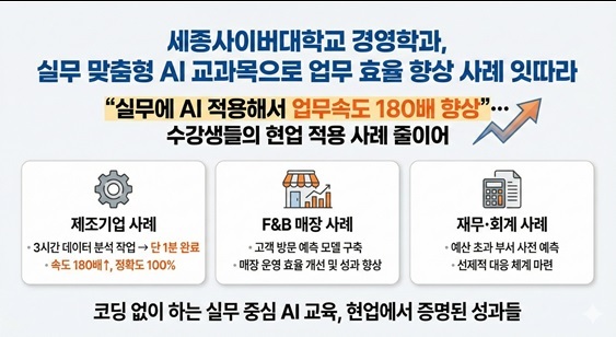 [비건뉴스=최지영 수습기자] 세종사이버대학교 경영학과는 비즈니스 현장에 바로 적용할 수 있는 실무 중심 AI 교과목을 강화한 결과, 수강생들이 실제 업무에 이를 적용해 가시적인 성과를 거두는 사례가 잇따르고 있다고 12일 밝혔다.