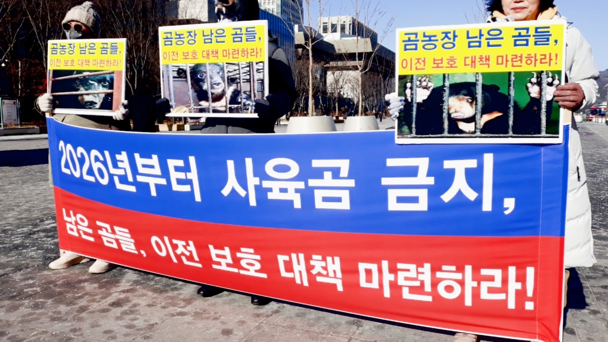 서울 광화문 이순신동상 앞에서 열린 한국동물보호연합과 동물에게자비를, 한국비건채식협회, 기후위기비건행동, 한국비건연대 주최 기자회견에서 참가자들이 철창에 갇힌 사육곰 사진이 담긴 피켓을 들고 있다.