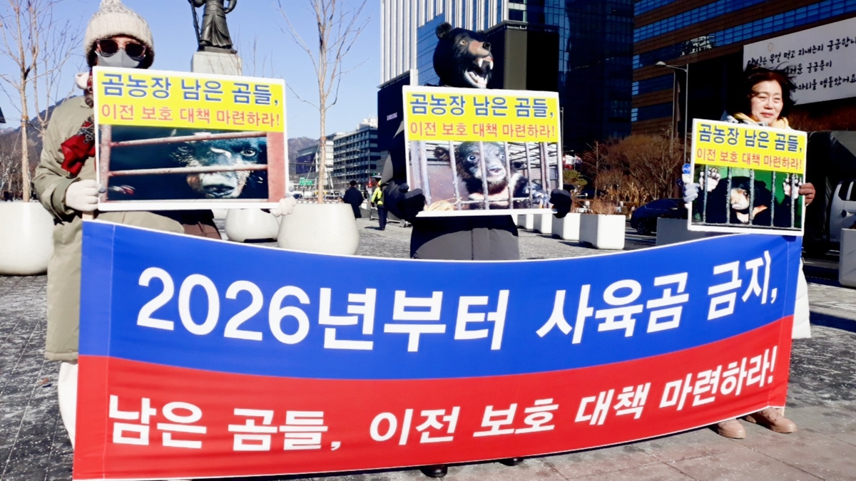 한국동물보호연합과 동물에게자비를, 한국비건채식협회, 기후위기비건행동, 한국비건연대가 주최한 기자회견에서 참가자들이 피켓을 들고 사육곰 이전 보호를 촉구하고 있다.