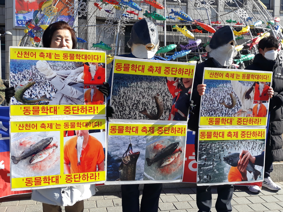 서울 중구 한국프레스센터 앞에서 열린 기자회견에서 참가자들이 산천어 가면을 쓰고 피켓을 든 채 서 있다. 이날 기자회견은 한국동물보호연합, 동물의목소리, 한국비건채식협회, 기후위기비건행동, 한국비건연대가 공동 주최했다.