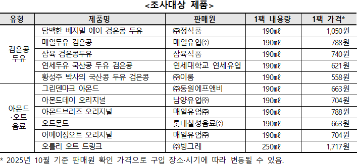 공식 평가에서 원료별 영양 성향은 뚜렷하게 갈렸다. 검은콩 두유는 단백질 함량이 상대적으로 높은 편으로 분류됐고, 오트 음료는 탄수화물 비중이 높았다. 아몬드 계열과 아몬드·오트 혼합 제품은 열량과 3대 영양소 함량이 비교적 낮은 유형으로 제시됐다. 가격은 검은콩 두유가 1팩 558원에서 1050원, 아몬드·오트 음료가 663원에서 1717원까지로 동일 유형 내 최대 2.6배 차이가 확인됐다.
