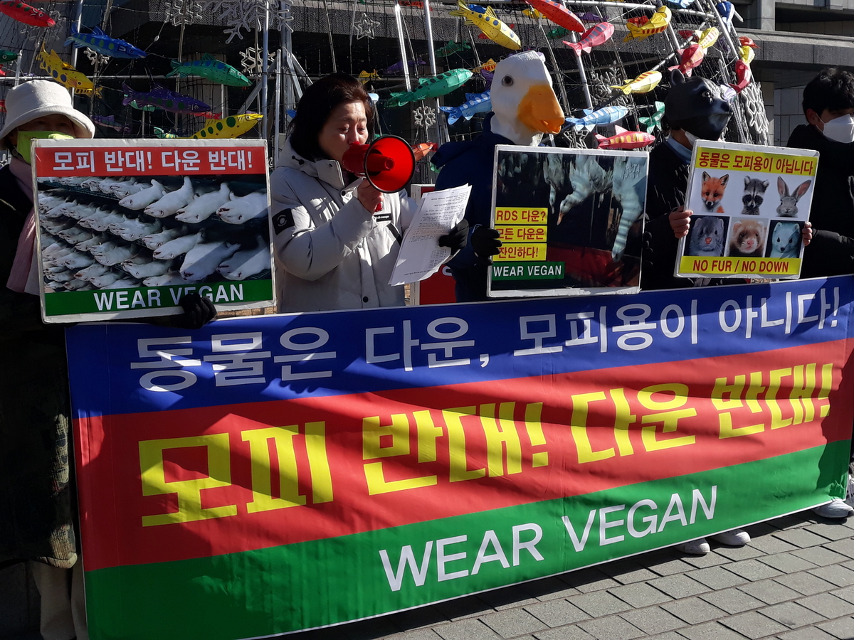 지난 20일 서울 중구 한국프레스센터 앞에서 열린 기자회견에서 참가자들이 ‘WEAR VEGAN’ 문구가 적힌 피켓을 들고 정면을 향해 서 있다. 참가자들은 모피와 다운 제품 사용 중단과 함께 동물을 해치지 않는 의류 선택을 촉구했다.