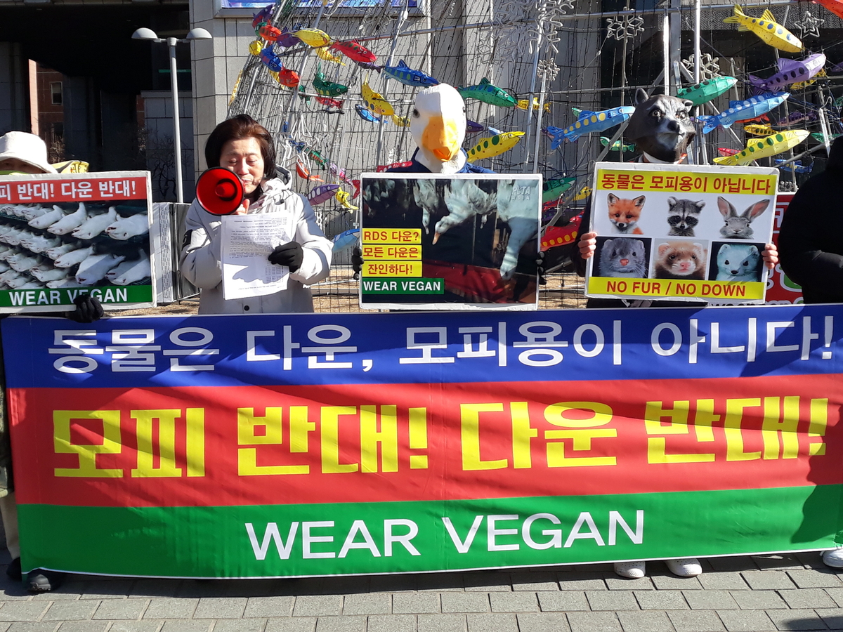 지난 20일 서울 중구 한국프레스센터 앞에서 열린 기자회견에서 참가자들이 ‘동물은 모피·다운용이 아니다’라는 문구가 적힌 현수막을 펼치고 있다. 현장에서는 모피와 다운 제품 사용 중단을 요구하는 피켓팅이 함께 진행됐다.