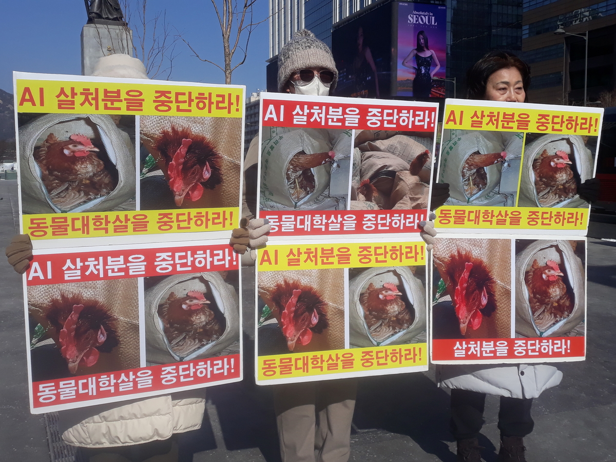27일 광화문에서 참가자들이 ‘AI 살처분을 즉각 중단하라’, ‘동물대학살을 중단하라’는 문구가 적힌 대형 현수막을 펼쳐 들고 기자회견을 진행하고 있다. 현수막에는 조류인플루엔자 대응 과정에서 이뤄지는 살처분 중단 요구가 담겼다. 이날 기자회견은 한국동물보호연합, 동물의목소리, 한국비건채식협회, 기후위기비건행동, 한국비건연대가 공동 주최했다.