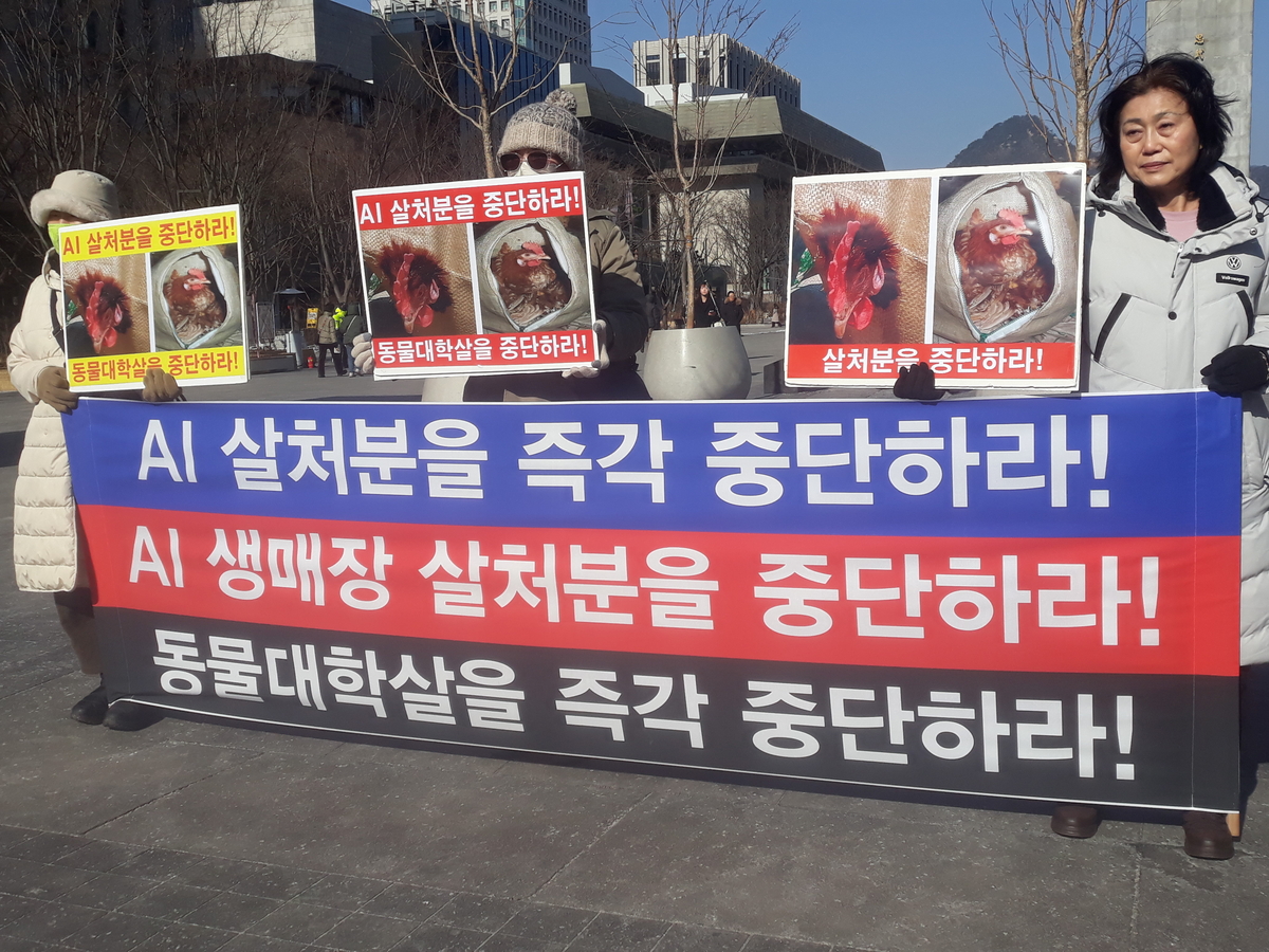 27일 광화문에서 참가자들이 조류인플루엔자 대응을 이유로 한 살처분 중단을 촉구하는 문구가 적힌 피켓을 들고 기자회견에 참여하고 있다. 피켓에는 닭의 이미지와 함께 살처분 중단 요구가 시각적으로 표현됐다. 이 기자회견은 한국동물보호연합, 동물의목소리, 한국비건채식협회, 기후위기비건행동, 한국비건연대가 공동 주최했다.
