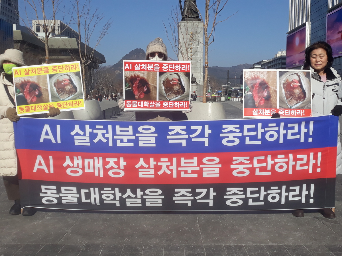 27일 광화문에서 참가자들이 현수막과 피켓을 들고 조류인플루엔자 대응 과정에서 이뤄지는 살처분 중단을 촉구하는 기자회견을 진행하고 있다. 참가자들은 요구 사항이 담긴 문구를 들어 현장에 섰다. 기자회견은 한국동물보호연합, 동물의목소리, 한국비건채식협회, 기후위기비건행동, 한국비건연대가 공동 주최했다.