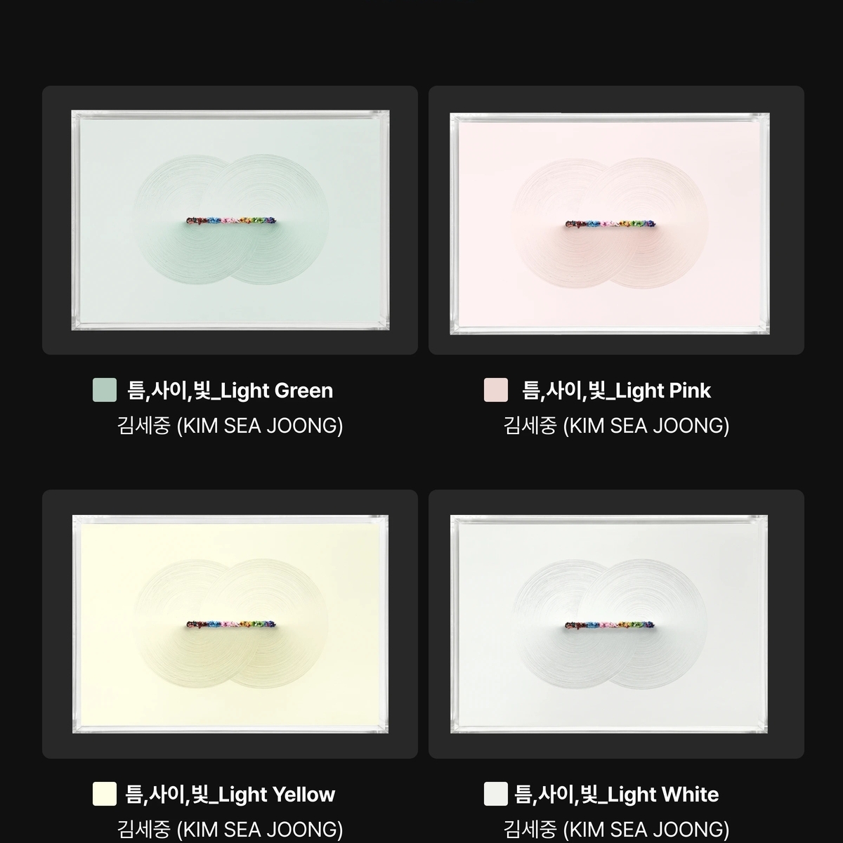 이번 작품은 ‘틈,사이,빛’ 시리즈로, Light Green, Light Pink, Light White, Light Yellow 등 4가지 컬러 버전으로 구성됐다. 각 작품은 15 에디션 한정으로 제작됐으며, 작가 친필 사인과 에디션 넘버가 기록되고 정품 보증서가 함께 제공된다.