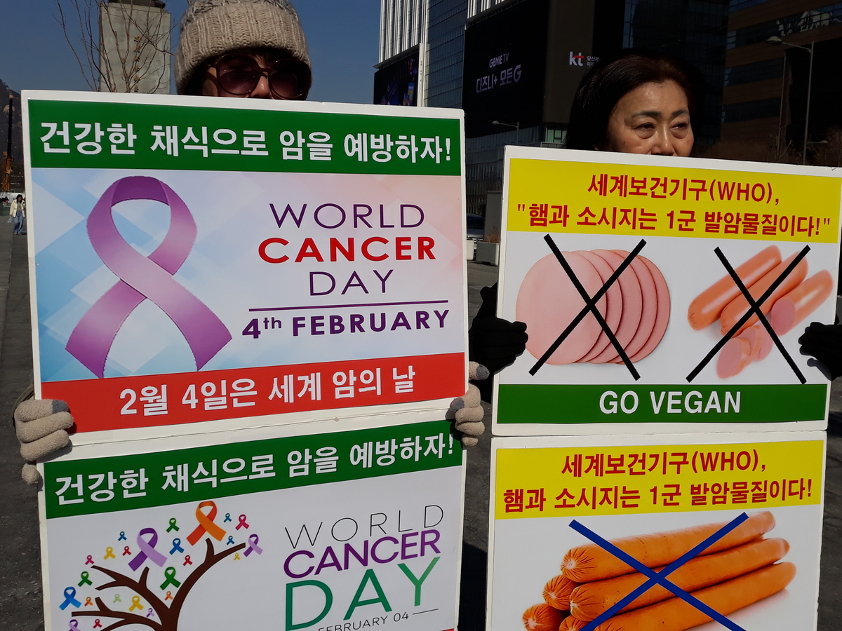 참가자가 ‘건강한 채식으로 암을 예방하자’는 문구가 적힌 피켓을 들고 있다.