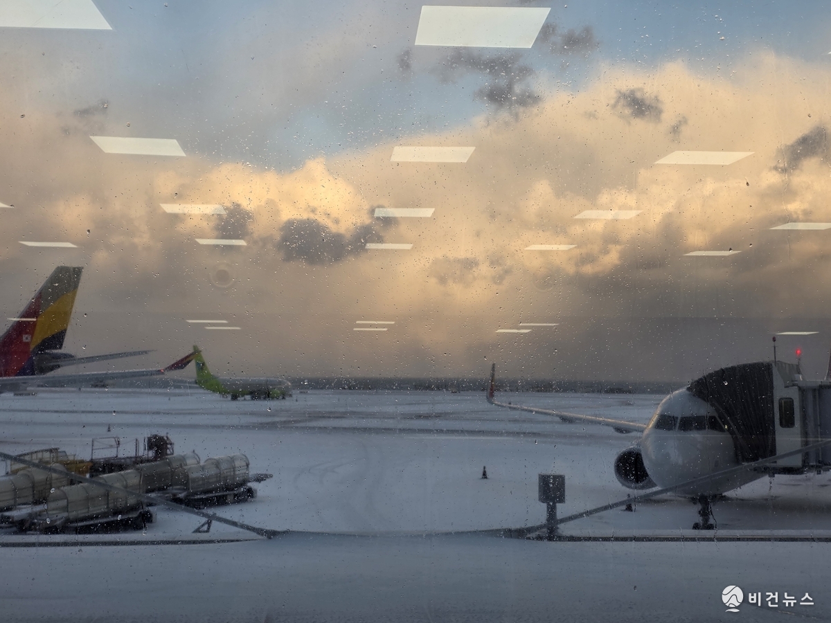 [비건뉴스] 8일 제주지역에 내린 폭설과 기상 악화로 제주국제공항 항공기 운항이 일시 중단되면서 결항과 지연이 잇따르고 있다.