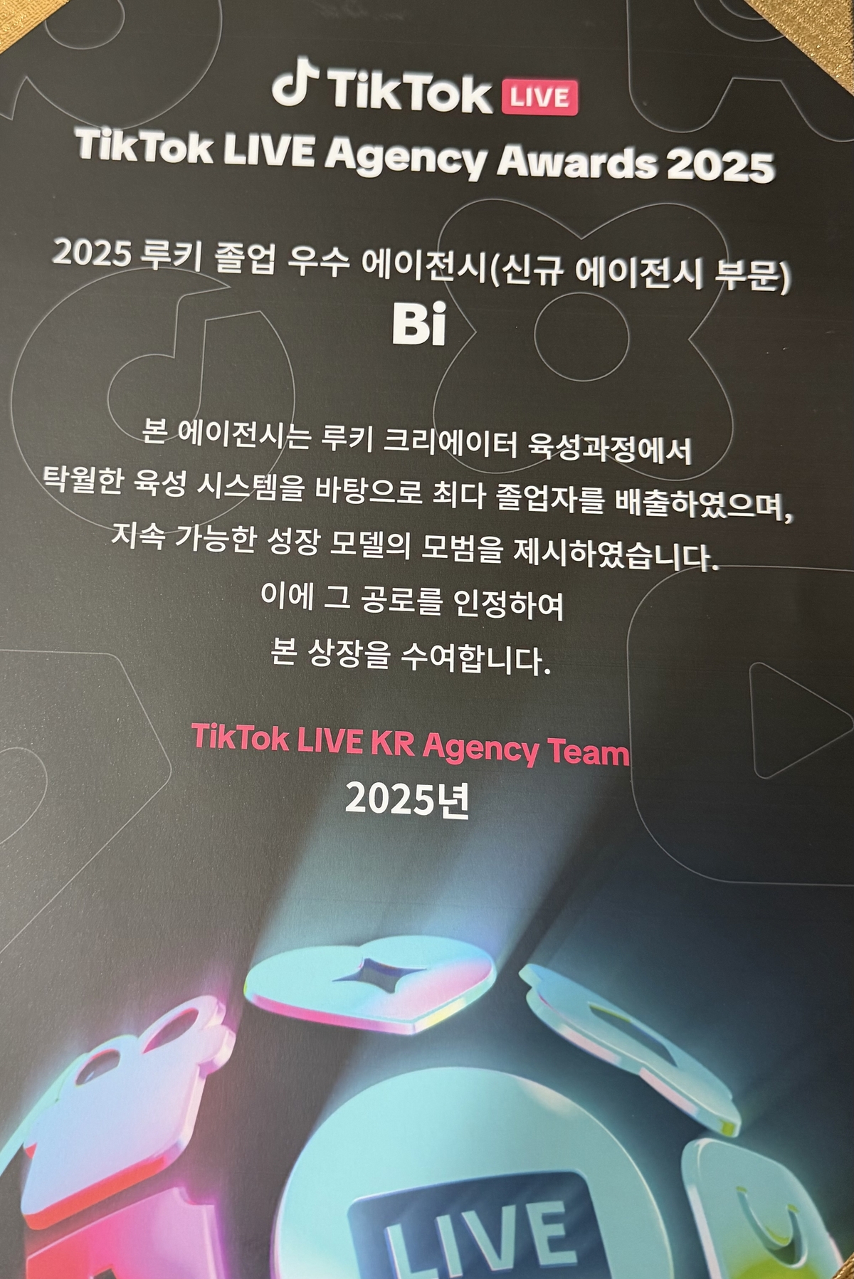 이와 함께 비아이 에이전시는 ‘TikTok LIVE Agency Awards 2025’에서 ‘2025 루키 졸업 우수 에이전시(신규 에이전시 부문)’로 선정됐다. 시상은 TikTok LIVE KR Agency Team 주관으로 진행됐으며, 플랫폼 내 활동 성과와 콘텐츠 성장 지표 등을 종합적으로 고려해 수상 에이전시를 결정했다.