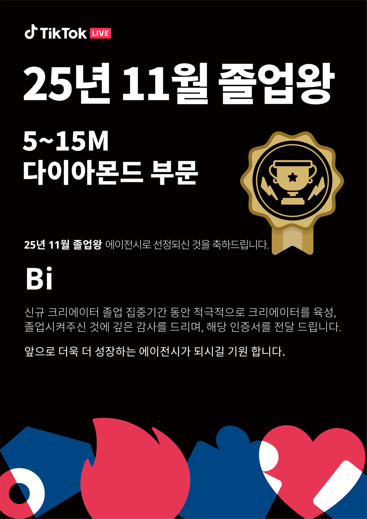 비아이 에이전시는 TikTok LIVE KOREA가 운영한 ‘TikTok LIVE FEST 25’ 신규 에이전시 과정에 참여해 루키 크리에이터 육성, 라이브 콘텐츠 운영 역량 강화, 내부 운영 체계 정립 등에 주력했으며, 그 결과 1월 15일부로 공식 수료 인증서를 발급받았다.