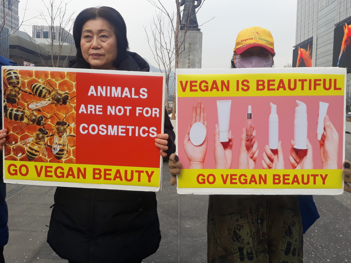 10일 광화문 이순신동상 앞에서 열린 비건 화장품·비건 뷰티 촉구 기자회견에서 참가자들이 관련 문구가 적힌 피켓을 들고 있다. 이날 기자회견은 한국동물보호연합, 한국비건채식협회, 기후위기비건행동, 한국비건연대, 한국채식연합이 공동 주최했다.