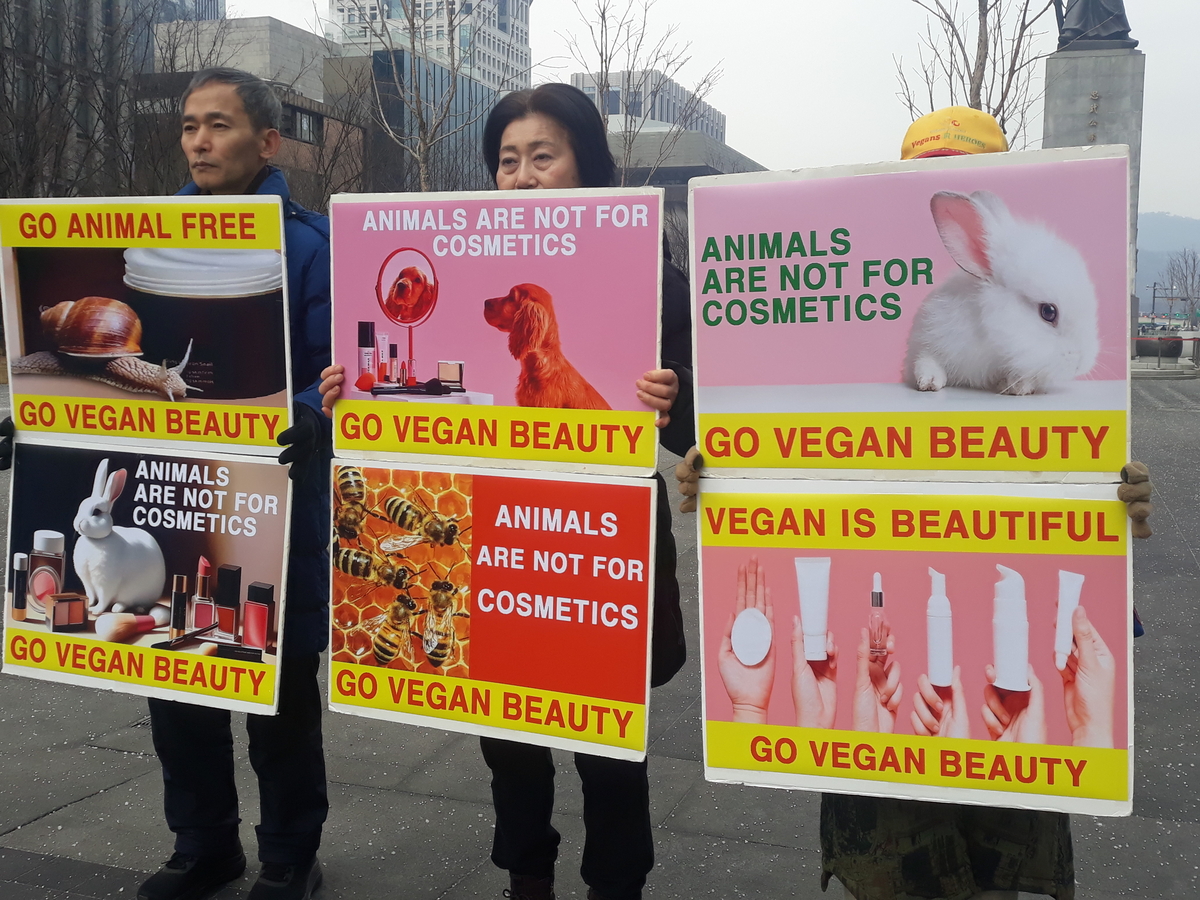 광화문 이순신동상 앞에서 열린 기자회견에서 참가자가 ‘GO VEGAN BEAUTY’ 문구가 적힌 피켓을 들고 비건 화장품과 비건 뷰티 확산을 촉구하고 있다. 이 기자회견은 한국동물보호연합, 한국비건채식협회, 기후위기비건행동, 한국비건연대, 한국채식연합이 공동 주최했다.