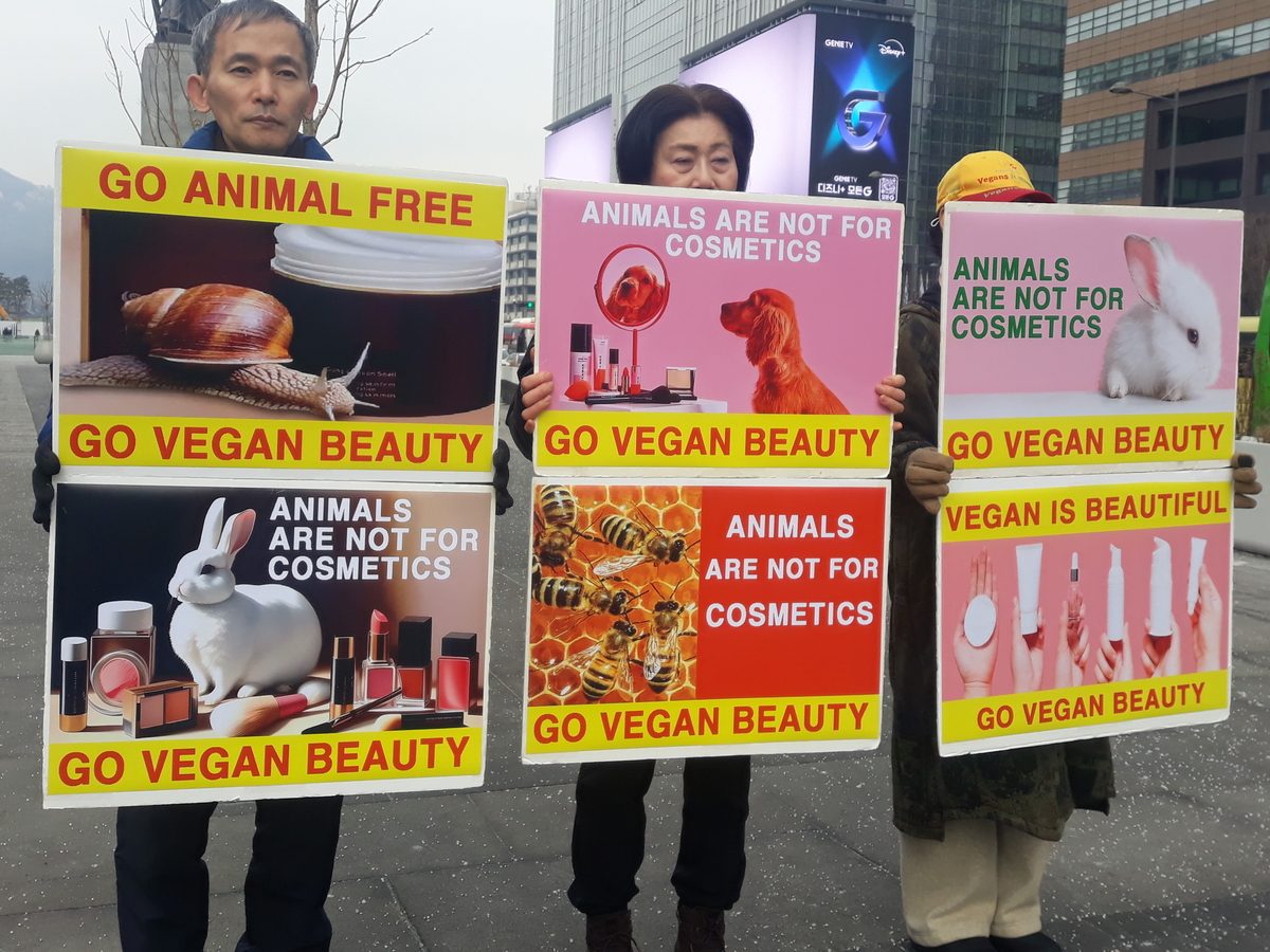 참가자가 ‘ANIMALS ARE NOT FOR COSMETICS’라고 적힌 영문 피켓을 들고 기자회견에 참여하고 있다. 이날 행사는 한국동물보호연합과 한국비건채식협회 등 단체들이 공동 주최했다.